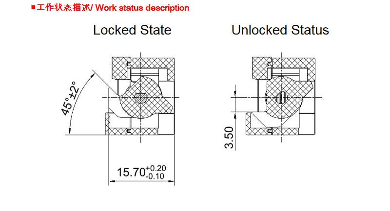 | Environment & Durability | Working Temp: -40℃ to +85℃; Dielectric Strength: AC 500V; Destructive Force (lock rod): ≥200N; Humidity: 45%–85%RH. |